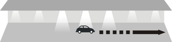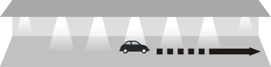 當汽車駛進停車場經過第一個PIR(熱釋電紅外傳感器),傳感器探測到有汽車進入,立即亮起車頭前方的3盞燈,燈的亮度客戶可以自行設置,設置范圍:50%~100%;