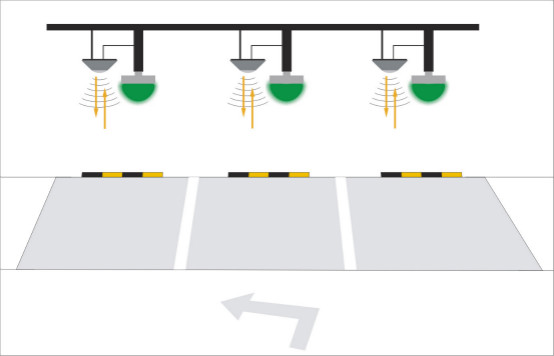 當停車位沒車輛停放時,我們的停車位車輛檢測燈光控制器發出的超聲波探測到沒有車輛,指示燈亮著綠燈。注:指示燈和停車位車輛檢測燈光控制器可以安裝在一個盒子里。